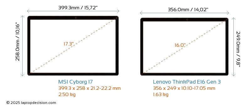 HDMIBoth Cyborg 17 and ThinkPad E16 Gen 3 feature an HDMI port (1x HDMI 2.1) for connecting to external monitors.