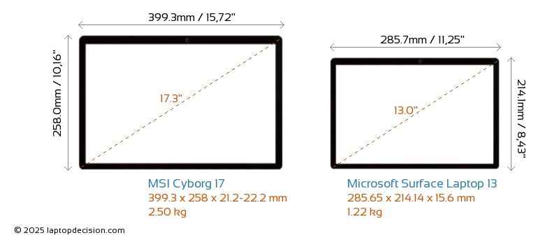 HDMI Cyborg 17 features an HDMI port (1x HDMI 2.1) for connecting to external monitors. Surface Laptop 13 does not have an HDMI port.
