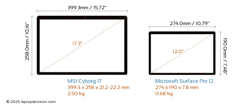HDMI Cyborg 17 features an HDMI port (1x HDMI 2.1) for connecting to external monitors. Surface Pro 12 does not have an HDMI port.
