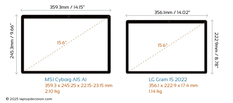 HDMIBoth Cyborg A15 AI and Gram 15 2022 feature an HDMI port. Cyborg A15 AI offers 1x HDMI 2.1, while Gram 15 2022 offers 1x HDMI 2.0.