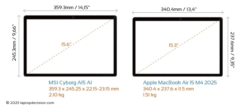 USB Cyborg A15 AI is equipped with 2x USB 3.2 USB-A ports. MacBook Air 15 M4 2025 does not have USB-A ports.Both Cyborg A15 AI and MacBook Air 15 M4 2025 have USB Type-C ports. Cyborg A15 AI has 1x USB 3.2 USB Type-C ports, while MacBook Air 15 M4 2025 has 2x USB 4.0 USB Type-C ports.