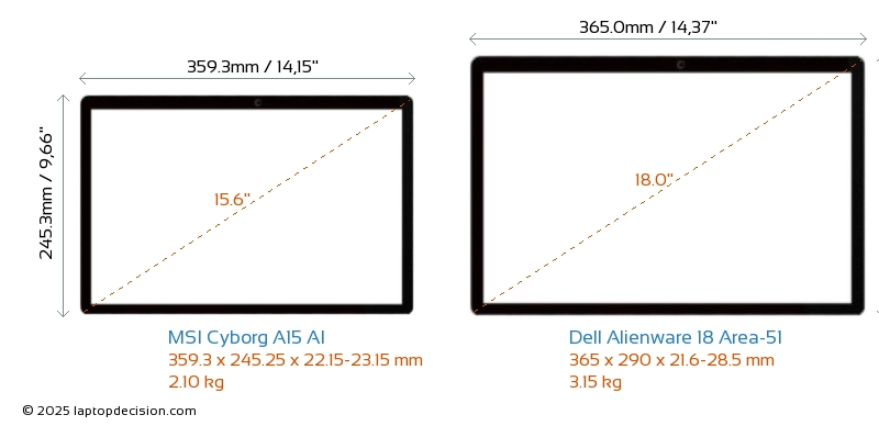 USBBoth Cyborg A15 AI and Alienware 18 Area-51 have USB-A ports. Cyborg A15 AI has 2x USB 3.2 USB-A ports, while Alienware 18 Area-51 has 3x USB 3.2 USB-A ports.Both Cyborg A15 AI and Alienware 18 Area-51 have USB Type-C ports. Cyborg A15 AI has 1x USB 3.2 USB Type-C ports, while Alienware 18 Area-51 has 2x USB 4.0 USB Type-C ports.