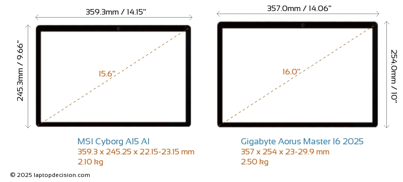 USBBoth Cyborg A15 AI and Aorus Master 16 2025 feature 2x USB 3.2 USB-A ports.Both Cyborg A15 AI and Aorus Master 16 2025 have USB Type-C ports. Cyborg A15 AI has 1x USB 3.2 USB Type-C ports, while Aorus Master 16 2025 has 2x USB 4.0 USB Type-C ports.