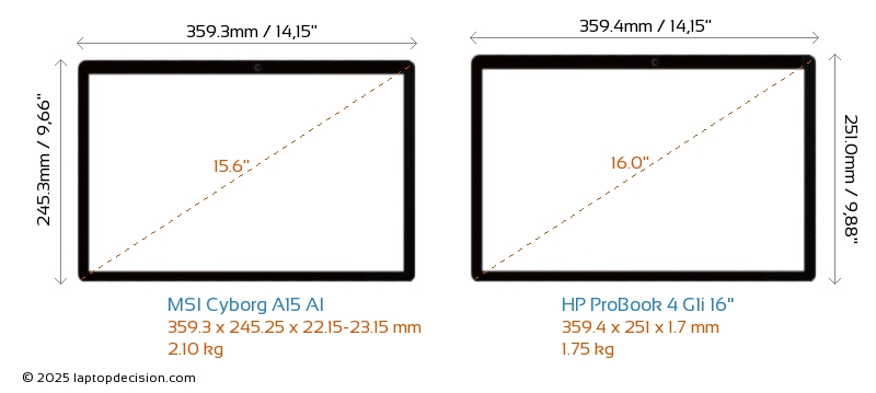 HDMIBoth Cyborg A15 AI and ProBook 4 G1i 16" feature an HDMI port (1x HDMI 2.1) for connecting to external monitors.