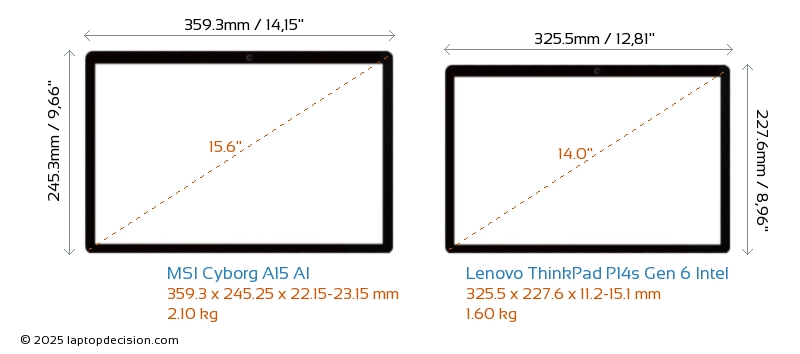 HDMIBoth Cyborg A15 AI and ThinkPad P14s Gen 6 Intel feature an HDMI port (1x HDMI 2.1) for connecting to external monitors.