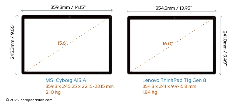 HDMIBoth Cyborg A15 AI and ThinkPad T1g Gen 8 feature an HDMI port (1x HDMI 2.1) for connecting to external monitors.