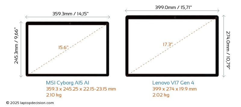HDMIBoth Cyborg A15 AI and V17 Gen 4 feature an HDMI port. Cyborg A15 AI offers 1x HDMI 2.1, while V17 Gen 4 offers 1x HDMI 1.4.