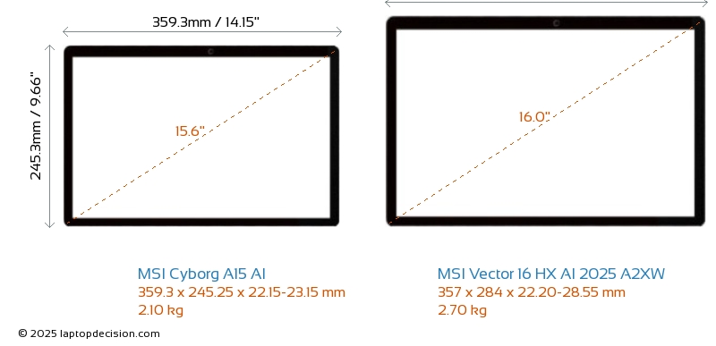 USBBoth Cyborg A15 AI and Vector 16 HX AI 2025 A2XW feature 2x USB 3.2 USB-A ports.Both Cyborg A15 AI and Vector 16 HX AI 2025 A2XW have USB Type-C ports. Cyborg A15 AI has 1x USB 3.2 USB Type-C ports, while Vector 16 HX AI 2025 A2XW has 2x USB 4.0 USB Type-C ports.