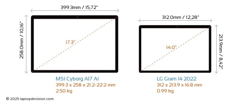 HDMIBoth Cyborg A17 AI and Gram 14 2022 feature an HDMI port. Cyborg A17 AI offers 1x HDMI 2.1, while Gram 14 2022 offers 1x HDMI 2.0.