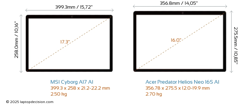 HDMIBoth Cyborg A17 AI and Predator Helios Neo 16S AI feature an HDMI port (1x HDMI 2.1) for connecting to external monitors.