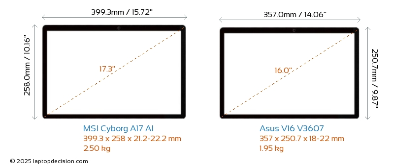 USBBoth Cyborg A17 AI and V16 V3607 feature 2x USB 3.2 USB-A ports.Both Cyborg A17 AI and V16 V3607 feature 1x USB 3.2 USB Type-C ports.