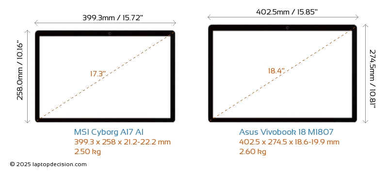 USBBoth Cyborg A17 AI and Vivobook 18 M1807 feature 2x USB 3.2 USB-A ports.Both Cyborg A17 AI and Vivobook 18 M1807 have USB Type-C ports. Cyborg A17 AI has 1x USB 3.2 USB Type-C ports, while Vivobook 18 M1807 has 2x USB 4.0 USB Type-C ports.
