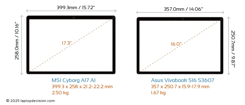 USBBoth Cyborg A17 AI and Vivobook S16 S3607 feature 2x USB 3.2 USB-A ports.Both Cyborg A17 AI and Vivobook S16 S3607 have USB Type-C ports. Cyborg A17 AI has 1x USB 3.2 USB Type-C ports, while Vivobook S16 S3607 has 2x USB 4.0 USB Type-C ports.