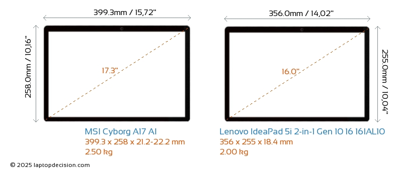 HDMIBoth Cyborg A17 AI and IdeaPad 5i 2-in-1 Gen 10 16 16IAL10 feature an HDMI port. Cyborg A17 AI offers 1x HDMI 2.1, while IdeaPad 5i 2-in-1 Gen 10 16 16IAL10 offers 1x HDMI 1.4.