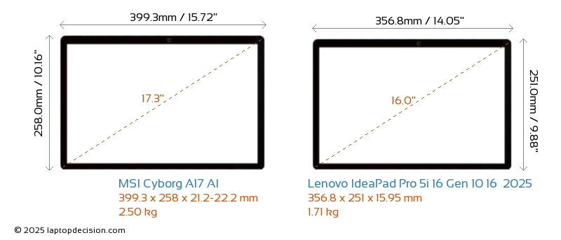 USBBoth Cyborg A17 AI and IdeaPad Pro 5i 16 Gen 10 16 2025 feature 2x USB 3.2 USB-A ports.Both Cyborg A17 AI and IdeaPad Pro 5i 16 Gen 10 16 2025 have USB Type-C ports. Cyborg A17 AI has 1x USB 3.2 USB Type-C ports, while IdeaPad Pro 5i 16 Gen 10 16 2025 has 2x USB 4.0 USB Type-C ports.