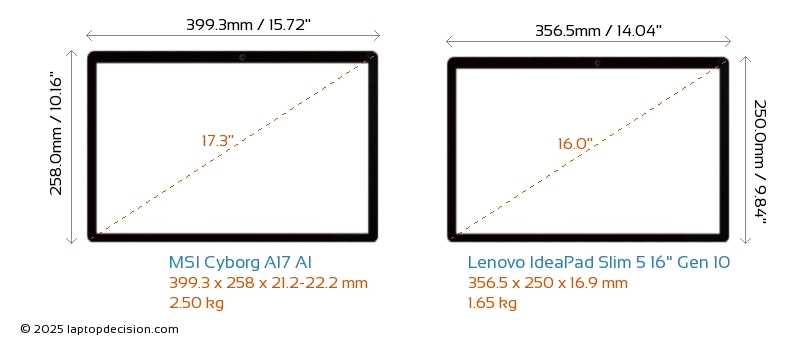 HDMIBoth Cyborg A17 AI and IdeaPad Slim 5 16" Gen 10 feature an HDMI port. Cyborg A17 AI offers 1x HDMI 2.1, while IdeaPad Slim 5 16" Gen 10 offers 1x HDMI 1.4.