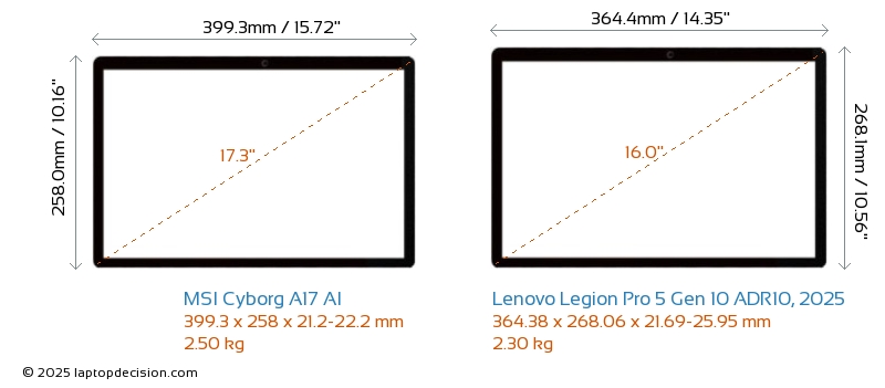 USBBoth Cyborg A17 AI and Legion Pro 5 Gen 10 ADR10, 2025 have USB-A ports. Cyborg A17 AI has 2x USB 3.2 USB-A ports, while Legion Pro 5 Gen 10 ADR10, 2025 has 3x USB 3.2 USB-A ports.Both Cyborg A17 AI and Legion Pro 5 Gen 10 ADR10, 2025 have USB Type-C ports. Cyborg A17 AI has 1x USB 3.2 USB Type-C ports, while Legion Pro 5 Gen 10 ADR10, 2025 has 2x USB 4.0 USB Type-C ports.
