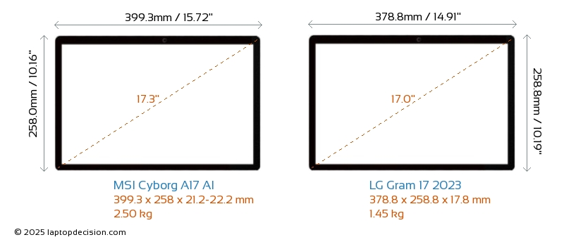 HDMIBoth Cyborg A17 AI and Gram 17 2023 feature an HDMI port. Cyborg A17 AI offers 1x HDMI 2.1, while Gram 17 2023 offers 1x HDMI 2.0.
