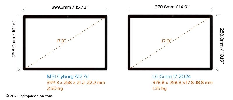 USBBoth Cyborg A17 AI and Gram 17 2024 feature 2x USB 3.2 USB-A ports.Both Cyborg A17 AI and Gram 17 2024 have USB Type-C ports. Cyborg A17 AI has 1x USB 3.2 USB Type-C ports, while Gram 17 2024 has 2x USB 4.0 USB Type-C ports.