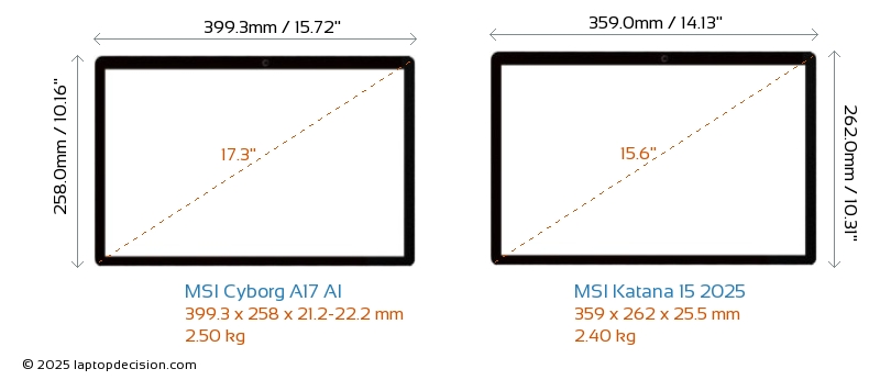 USBBoth Cyborg A17 AI and Katana 15 2025 have USB-A ports. Cyborg A17 AI has 2x USB 3.2 USB-A ports, while Katana 15 2025 has 3x USB 3.2 USB-A ports.Both Cyborg A17 AI and Katana 15 2025 feature 1x USB 3.2 USB Type-C ports.