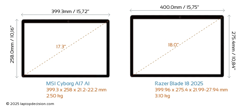 USBBoth Cyborg A17 AI and Blade 18 2025 have USB-A ports. Cyborg A17 AI has 2x USB 3.2 USB-A ports, while Blade 18 2025 has 3x USB 3.2 USB-A ports.Both Cyborg A17 AI and Blade 18 2025 have USB Type-C ports. Cyborg A17 AI has 1x USB 3.2 USB Type-C ports, while Blade 18 2025 has 2x USB 4.0 USB Type-C ports.