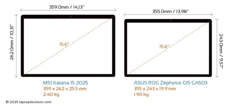 USBBoth Katana 15 2025 and ROG Zephyrus G15 GA503 have USB-A ports. Katana 15 2025 has 3x USB 3.2 USB-A ports, while ROG Zephyrus G15 GA503 has 2x USB 3.2 USB-A ports.Both Katana 15 2025 and ROG Zephyrus G15 GA503 have USB Type-C ports. Katana 15 2025 has 1x USB 3.2 USB Type-C ports, while ROG Zephyrus G15 GA503 has 2x USB 3.2 USB Type-C ports.