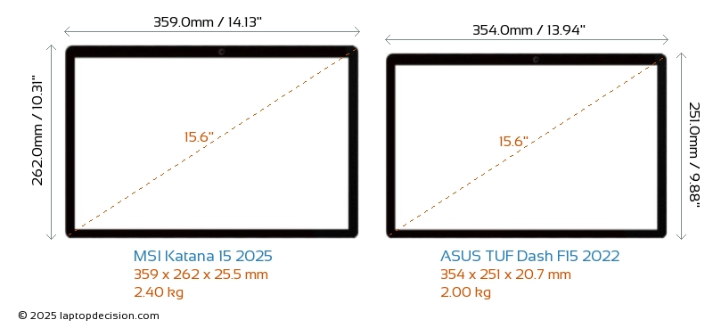 USBBoth Katana 15 2025 and TUF Dash F15 2022 have USB-A ports. Katana 15 2025 has 3x USB 3.2 USB-A ports, while TUF Dash F15 2022 has 2x USB 3.2 USB-A ports.Both Katana 15 2025 and TUF Dash F15 2022 have USB Type-C ports. Katana 15 2025 has 1x USB 3.2 USB Type-C ports, while TUF Dash F15 2022 has 2x USB 3.2 USB Type-C ports.