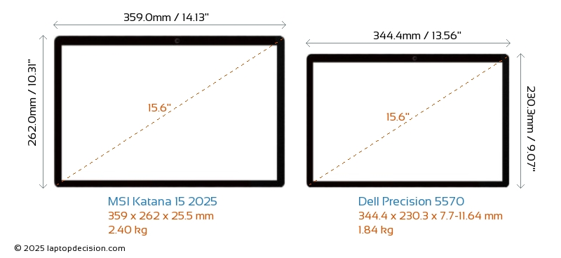 HDMI Katana 15 2025 features an HDMI port (1x HDMI 2.1) for connecting to external monitors. Precision 5570 does not have an HDMI port.