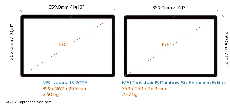 HDMIBoth Katana 15 2025 and Crosshair 15 Rainbow Six Extraction Edition feature an HDMI port. Katana 15 2025 offers 1x HDMI 2.1, while Crosshair 15 Rainbow Six Extraction Edition offers 1x HDMI 2.0.