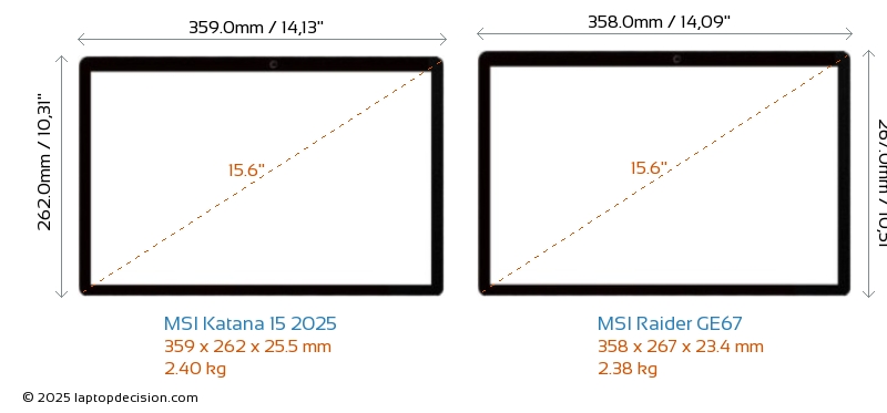 USBBoth Katana 15 2025 and Raider GE67 feature 3x USB 3.2 USB-A ports.Both Katana 15 2025 and Raider GE67 have USB Type-C ports. Katana 15 2025 has 1x USB 3.2 USB Type-C ports, while Raider GE67 has 2x USB 3.2 USB Type-C ports.