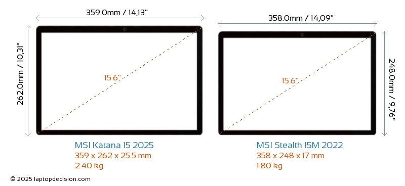 Wifi Katana 15 2025 features a more advanced Wi-Fi standard v6E, providing faster and more reliable wireless connections compared to Stealth 15M 2022 (v6).
