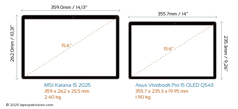 USBBoth Katana 15 2025 and Vivobook Pro 15 OLED Q543 have USB-A ports. Katana 15 2025 has 3x USB 3.2 USB-A ports, while Vivobook Pro 15 OLED Q543 has 2x USB 3.2 USB-A ports.Both Katana 15 2025 and Vivobook Pro 15 OLED Q543 have USB Type-C ports. Katana 15 2025 has 1x USB 3.2 USB Type-C ports, while Vivobook Pro 15 OLED Q543 has 2x USB 3.2 USB Type-C ports.
