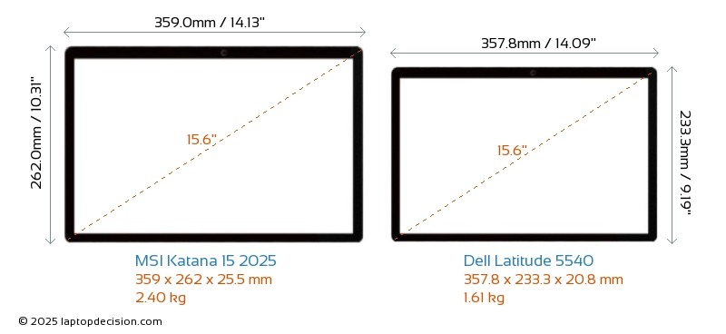 USBBoth Katana 15 2025 and Latitude 5540 have USB-A ports. Katana 15 2025 has 3x USB 3.2 USB-A ports, while Latitude 5540 has 2x USB 3.2 USB-A ports.Both Katana 15 2025 and Latitude 5540 have USB Type-C ports. Katana 15 2025 has 1x USB 3.2 USB Type-C ports, while Latitude 5540 has 2x USB 4.0 USB Type-C ports.