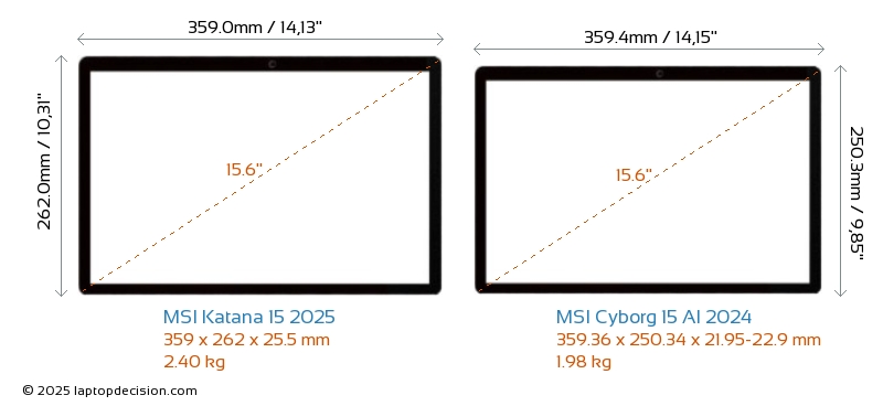 HDMIBoth Katana 15 2025 and Cyborg 15 AI 2024 feature an HDMI port (1x HDMI 2.1) for connecting to external monitors.