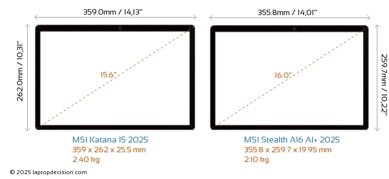 USBBoth Katana 15 2025 and Stealth A16 AI+ 2025 have USB-A ports. Katana 15 2025 has 3x USB 3.2 USB-A ports, while Stealth A16 AI+ 2025 has 2x USB 3.2 USB-A ports.Both Katana 15 2025 and Stealth A16 AI+ 2025 have USB Type-C ports. Katana 15 2025 has 1x USB 3.2 USB Type-C ports, while Stealth A16 AI+ 2025 has 1x USB 4.0 USB Type-C ports.