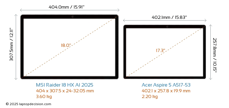 HDMIBoth Raider 18 HX AI 2025 and Aspire 5 A517-53 feature an HDMI port. Raider 18 HX AI 2025 offers 1x HDMI 2.1, while Aspire 5 A517-53 offers 1x HDMI 2.0.
