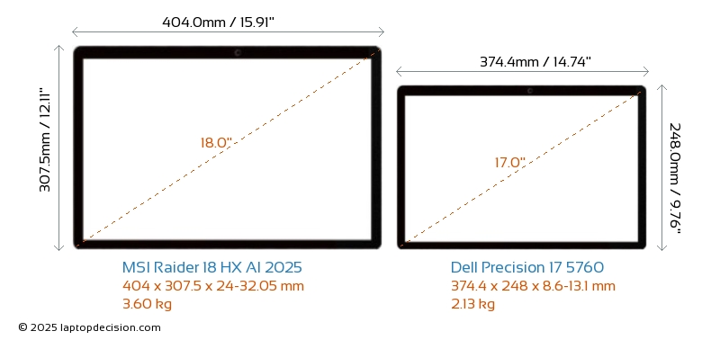 HDMI Raider 18 HX AI 2025 features an HDMI port (1x HDMI 2.1) for connecting to external monitors. Precision 17 5760 does not have an HDMI port.