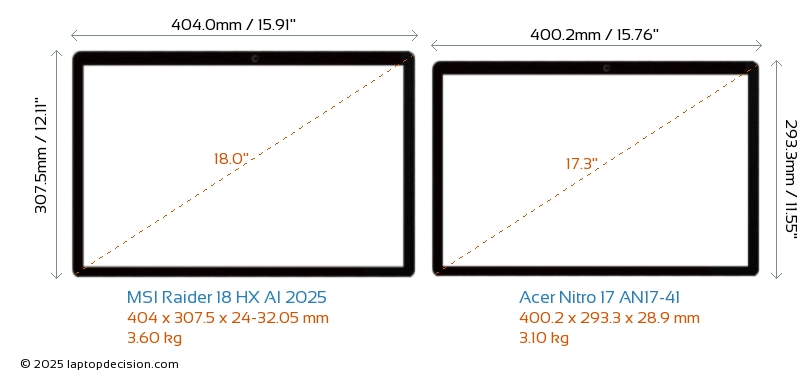 USBBoth Raider 18 HX AI 2025 and Nitro 17 AN17-41 feature 3x USB 3.2 USB-A ports.Both Raider 18 HX AI 2025 and Nitro 17 AN17-41 feature 2x USB 4.0 USB Type-C ports.