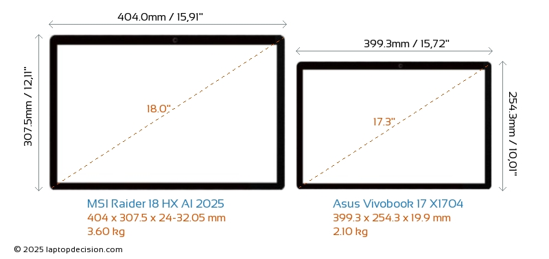 USBBoth Raider 18 HX AI 2025 and Vivobook 17 X1704 feature 3x USB 3.2 USB-A ports.Both Raider 18 HX AI 2025 and Vivobook 17 X1704 have USB Type-C ports. Raider 18 HX AI 2025 has 2x USB 4.0 USB Type-C ports, while Vivobook 17 X1704 has 1x USB 3.2 USB Type-C ports.