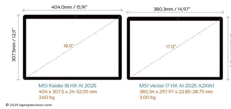 HDMIBoth Raider 18 HX AI 2025 and Vector 17 HX AI 2025 A2XWJ feature an HDMI port (1x HDMI 2.1) for connecting to external monitors.
