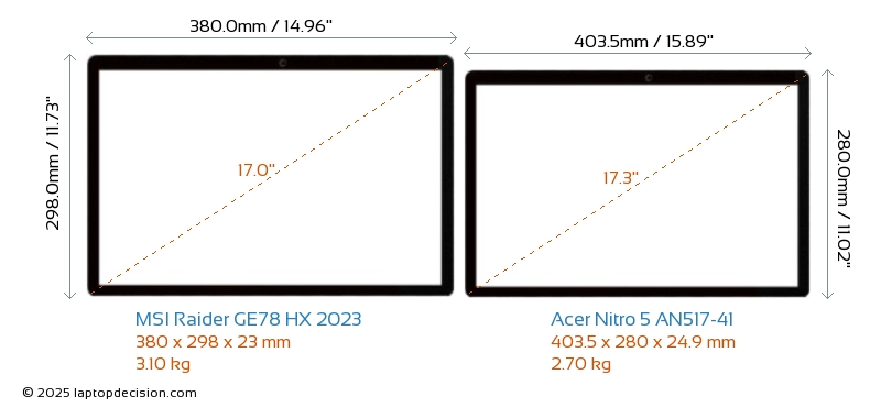 HDMIBoth Raider GE78 HX 2023 and Nitro 5 AN517-41 feature an HDMI port. Raider GE78 HX 2023 offers 1x HDMI 2.1, while Nitro 5 AN517-41 offers 1x HDMI 2.0.