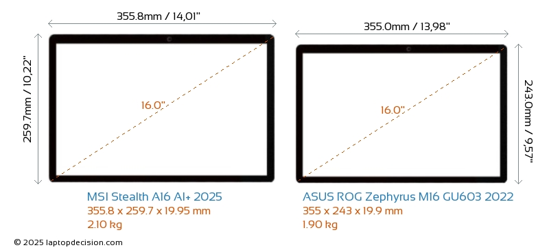 HDMIBoth Stealth A16 AI+ 2025 and ROG Zephyrus M16 GU603 2022 feature an HDMI port. Stealth A16 AI+ 2025 offers 1x HDMI 2.1, while ROG Zephyrus M16 GU603 2022 offers 1x HDMI 2.0.