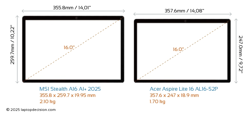 USBBoth Stealth A16 AI+ 2025 and Aspire Lite 16 AL16-52P have USB-A ports. Stealth A16 AI+ 2025 has 2x USB 3.2 USB-A ports, while Aspire Lite 16 AL16-52P has 3x USB 3.2 USB-A ports.Both Stealth A16 AI+ 2025 and Aspire Lite 16 AL16-52P have USB Type-C ports. Stealth A16 AI+ 2025 has 1x USB 4.0 USB Type-C ports, while Aspire Lite 16 AL16-52P has 1x USB 3.2 USB Type-C ports.