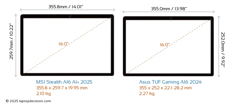 USBBoth Stealth A16 AI+ 2025 and TUF Gaming A16 2024 feature 2x USB 3.2 USB-A ports.Both Stealth A16 AI+ 2025 and TUF Gaming A16 2024 have USB Type-C ports. Stealth A16 AI+ 2025 has 1x USB 4.0 USB Type-C ports, while TUF Gaming A16 2024 has 2x USB 3.2 USB Type-C ports.