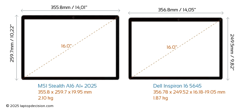 SD Card Reader Inspiron 16 5645 is equipped with an SD Card Reader for easy access to memory cards. Stealth A16 AI+ 2025 does not have an SD Card Reader.