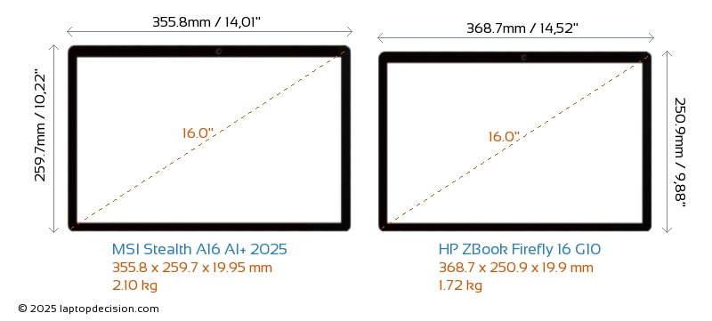 HDMIBoth Stealth A16 AI+ 2025 and ZBook Firefly 16 G10 feature an HDMI port. Stealth A16 AI+ 2025 offers 1x HDMI 2.1, while ZBook Firefly 16 G10 offers 1x HDMI 2.0.