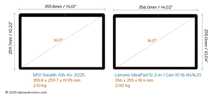 HDMIBoth Stealth A16 AI+ 2025 and IdeaPad 5i 2-in-1 Gen 10 16 16IAL10 feature an HDMI port. Stealth A16 AI+ 2025 offers 1x HDMI 2.1, while IdeaPad 5i 2-in-1 Gen 10 16 16IAL10 offers 1x HDMI 1.4.