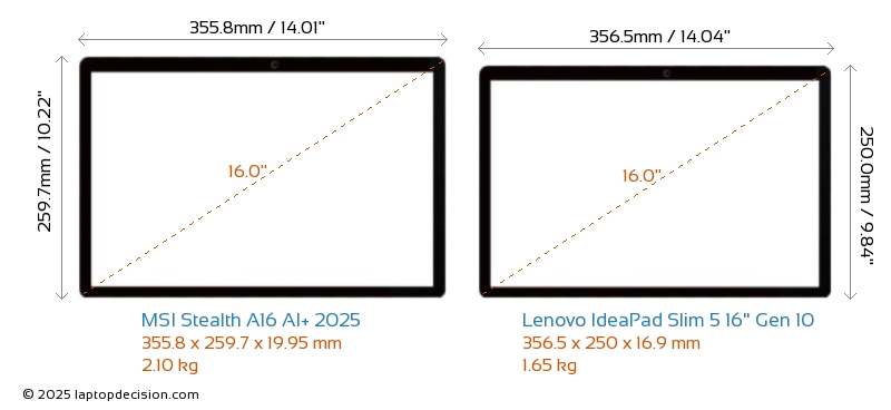 HDMIBoth Stealth A16 AI+ 2025 and IdeaPad Slim 5 16" Gen 10 feature an HDMI port. Stealth A16 AI+ 2025 offers 1x HDMI 2.1, while IdeaPad Slim 5 16" Gen 10 offers 1x HDMI 1.4.