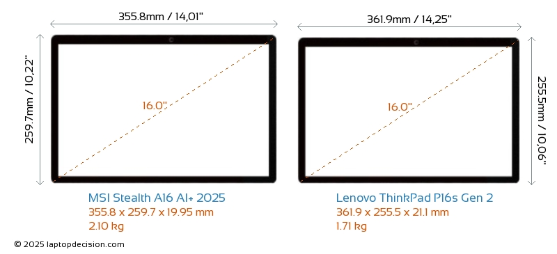 HDMIBoth Stealth A16 AI+ 2025 and ThinkPad P16s Gen 2 feature an HDMI port. Stealth A16 AI+ 2025 offers 1x HDMI 2.1, while ThinkPad P16s Gen 2 offers 1x HDMI 2.0.