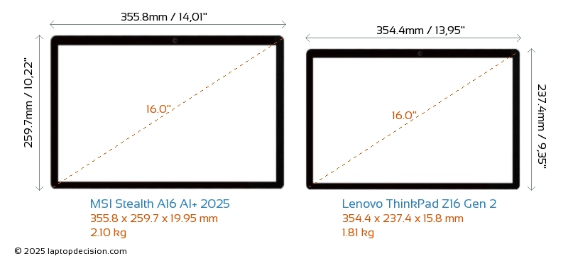 HDMI Stealth A16 AI+ 2025 features an HDMI port (1x HDMI 2.1) for connecting to external monitors. ThinkPad Z16 Gen 2 does not have an HDMI port.